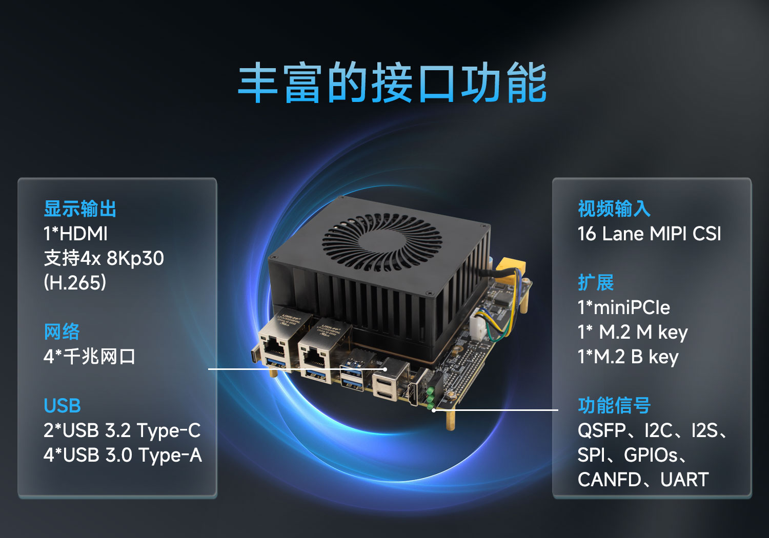 1*QSFP、2*I2C、1*I2S、1*SPI、1*GPIOs、 4*CANFD |
